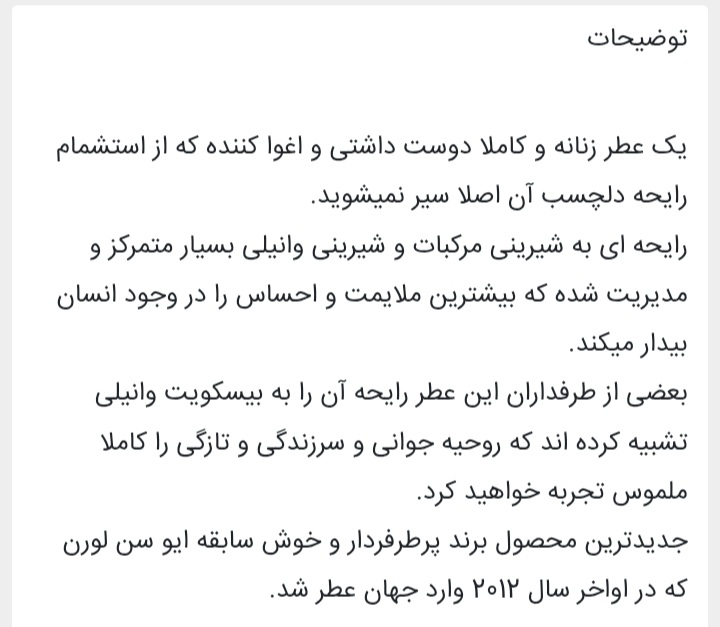 عطر فرانسوی . لیدی ویژه بانوان. رایحه گرم و شیرین نت های میانی وانیل و گل برف در نهایت با نت های چوبی ماندگار میشود 〰️〰️〰️〰️〰️قند عسل . بیسکویت مادر قدیمی. کارامل روی کيک تازه خوردنی ترین عطر یک جوری بوی گردن نی نی 👶 🥰 خودم عاشقانه دوستش دارم..لذت بوی زیبای زنانه گی و یک دختر جنتلمن یک خط بوی زیبا یک تمام روز به همه باید پاسخ دهی چه عطری استفاده کردی ...آقایون یک عطر شب و یک خواب راحت برای شما به حساب میآید